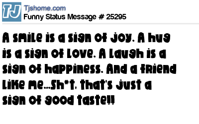 - # 61240 a smile is a sign of joy, a hug is a sign of love, a laugh is a sign of happiness and a friend like me...well...that's a sign of good taste.