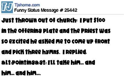 X was just thrown out of church: I put $100 in the offering plate and the Priest was so excited he asked me to come up front and pick three hymns. I replied, <pointing> I'll take him… and him… and him….