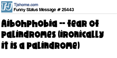 - # 165685 I suffer from a rare condition known as Aibohphobia, which is an unreasonable fear of palindromes.