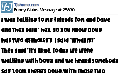 X I was talking to my friends Tom and Dave and they said " hey, do you know Doug has two a$$holes"? I said "What???" They said "It's true. Today we were walking with Doug and we heard somebody say 'Look, there's Doug.With those two a$$holes'"