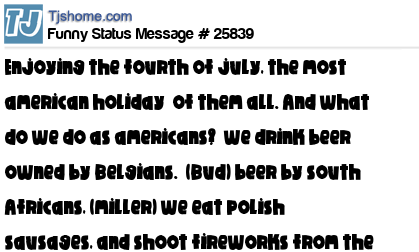 X is enjoying the fourth of july, the most american holiday of them all. And what do we do as americans? we drink beer owned by Belgians. (Bud) beer by south Africans, (miller) we eat polish sausages, and shoot fireworks from the Chinese.