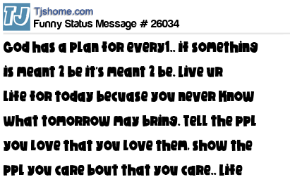 X God has a plan for every1.. if something is meant 2 be it's meant 2 be. Live ur life for today becuase you never know what tomorrow may bring. Tell the ppl you love that you love them, show the ppl you care bout that you care.. Life is 2 short 2 waste..