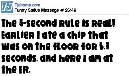 X The 5-second rule is real! Earlier I ate a chip that was on the floor for 6.7 seconds, and here I am at the ER.