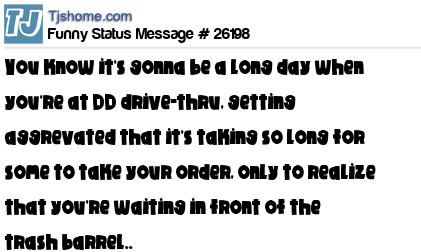 X says You know it's gonna be a long day when you're at DD drive-thru, getting aggrevated that it's taking so long for some to take your order, only to realize that you're waiting in front of the trash barrel..
