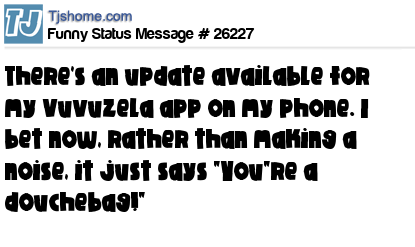 X There's an update available for my Vuvuzela app on my phone. I bet now, rather than making a noise, it just says "You"re a douchebag!"