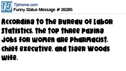 X says According to the Bureau of Labor Statistics, the top three paying jobs for women are pharmacist, chief executive, and Tiger Woods wife.