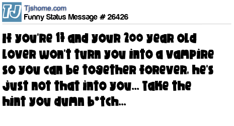 X If you're 17 and your 200 year old lover won't turn you into a vampire so you can be together forever, he's just not that into you... Take the hint you dumn b*tch...