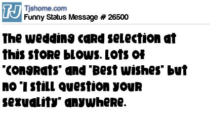 X The wedding card selection at this store blows. Lots of "Congrats" and "Best wishes" but no "I still question your sexuality" anywhere.