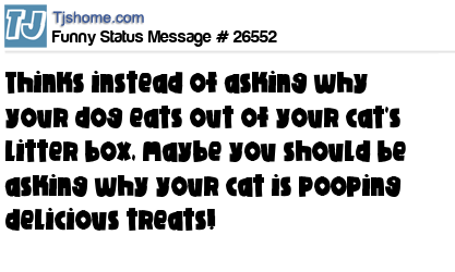 X thinks instead of asking why your dog eats out of your cat's litter box, maybe you should be asking why your cat is pooping delicious treats!