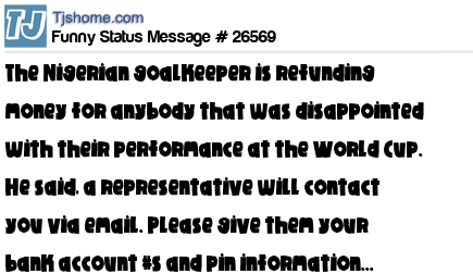 X The Nigerian goalkeeper is refunding money for anybody that was disappointed with their performance at the World Cup. He said, a representative will contact you via email. Please give them your bank account #s and pin information...
