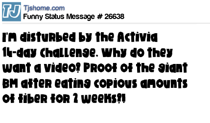 X says I'm disturbed by the Activia 14-day Challenge. Why do they want a video? Proof of the giant BM after eating copious amounts of fiber for 2 weeks?!
