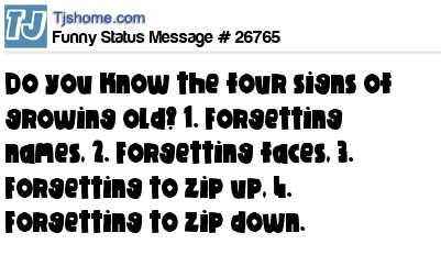 X Do you know the four signs of growing old? 1. Forgetting names, 2. Forgetting faces, 3. Forgetting to zip up, 4. Forgetting to zip down.