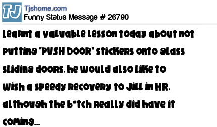 X learnt a valuable lesson today about not putting "PUSH DOOR" stickers onto glass sliding doors, he would also like to wish a speedy recovery to Jill in HR, although the b*tch really did have it coming...
