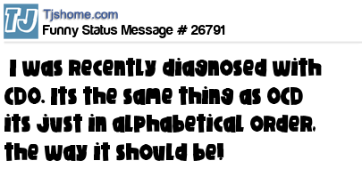 X   I was recently diagnosed with CDO. Its the same thing as OCD its just in alphabetical order, the way it should be!