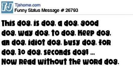 - # 33876 This dog, is dog, a dog, good dog, way dog, to dog, keep dog, an dog, idiot dog, busy dog, for dog, 30 dog, seconds dog! … Now read without the word dog. (^_*)