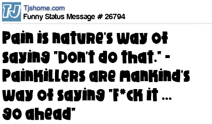 X  Pain is nature's way of saying "Don't do that." - Painkillers are mankind's way of saying "F*ck it ... go ahead"