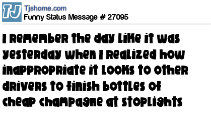 X is I remember the day like it was yesterday when I realized how inappropriate it looks to other drivers to finish bottles of cheap champagne at stoplights