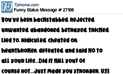 X says You've been backstabbed, rejected, unwanted, abandoned, betrayed, tricked, lied to, ridiculed, cheated on, heartbroken, defeated, and said NO to all your life...Did it kill you? Of course not...just made you stronger. USE IT.