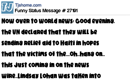 X Now over to world news: Good evening, the UN declared that they will be sending relief aid to Haiti in hopes that the victims of the...Oh..hang on.. this just coming in on the news wire..Lindsay Lohan was taken into custody today for probation violation..
