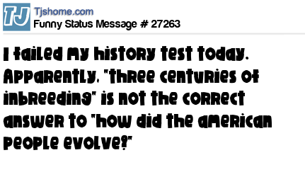 X says I failed my history test today. Apparently, "three centuries of inbreeding" is not the correct answer to "how did the american people evolve?"