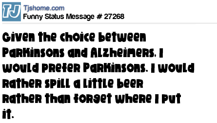 - # 40786 Thinks given the choice between Parkinson's and Alzheimer's, I would prefer Parkinson's. I would rather spill a little beer rather than forget where I put it.