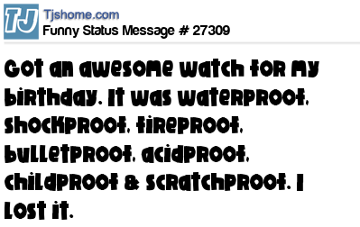 - # 189041 i bought an awesome watch the other day, It was waterproof, shockproof, fireproof, bulletproof, acidproof, childproof & scratchproof. I lost it.