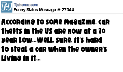 - # 130294 According to national reports, car thefts in the US are now at a 20 year low...Well, sure, it's hard to steal a car when the owner's living in it...