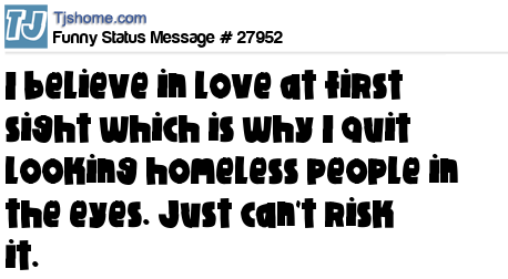 - # 32155 I believe in love at first sight....which is exactly why I stopped looking homeless people in the eyes. Just cant risk it.