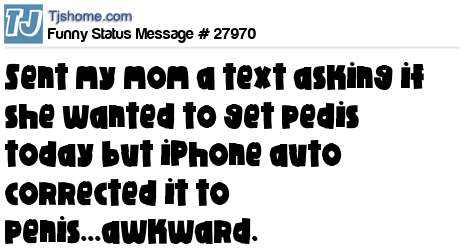 X  sent my mom a text asking if she wanted to get pedis today but iPhone auto corrected it to penis...awkward.