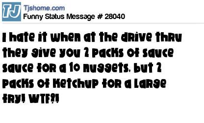 X I hate it when at the drive thru they give you 2 packs of sauce sauce for a 10 nuggets, but 2 packs of ketchup for a large fry! WTF?!