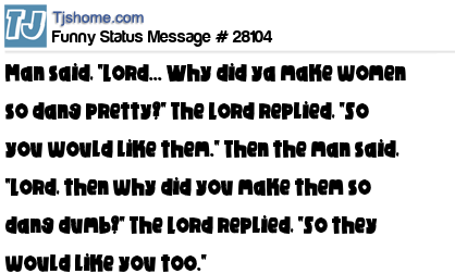X Man said, "Lord... Why did ya make women so dang pretty?" The Lord replied, "So you would like them." Then the man said, "Lord, then why did you make them so dang dumb?" The Lord replied, "So they would like you too."