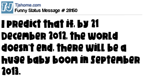 X says I predict that if, by 21 December 2012, the world doesn't end, there will be a huge baby boom in September 2013.