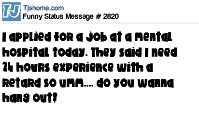 - # 95747 I applied for a job in a Pshyc Ward. They said I need 24 hrs experience with a retard... So I was wondering, what are you doing tomorrow.