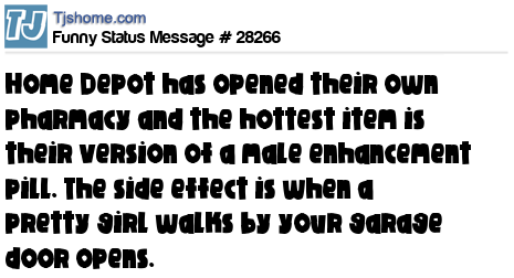 X Home Depot has opened their own pharmacy and the hottest item is their version of a male enhancement pill. The side effect is when a pretty girl walks by your garage door opens.