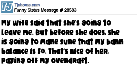 X My wife said that she's going to leave me. But before she does, she is going to make sure that my bank balance is $0. That's nice of her, paying off my overdraft.