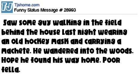 X Saw some guy walking in the field behind the house last night wearing an old hockey mask and carrying a machete. He wandered into the woods. Hope he found his way home. Poor fella.
