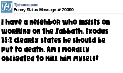 X I have a neighbor who insists on working on the Sabbath. Exodus 35:2 clearly states he should be put to death. Am I morally obligated to kill him myself?