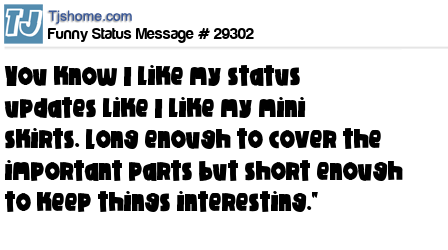 X is You know I like my status updates like I like my mini skirts. Long enough to cover the important parts but short enough to keep things interesting."