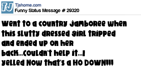 X  went to a country jamboree when this slutty dressed girl tripped and ended up on her back...Couldn't help it...I yelled Now that's a HO DOWN!!!
