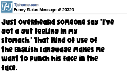 X Just overheard someone say "I've got a gut feeling in my stomach." That kind of use of the English language makes me want to punch his face in the face.