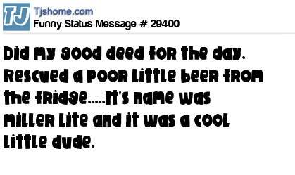 X Did my good deed for the day. Rescued a poor little beer from the fridge.....It's name was miller lite and it was a cool little dude.
