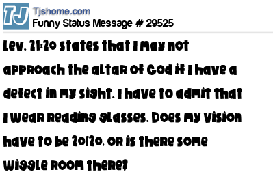 X Lev. 21:20 states that I may not approach the altar of God if I have a defect in my sight. I have to admit that I wear reading glasses. Does my vision have to be 20/20, or is there some wiggle room there?