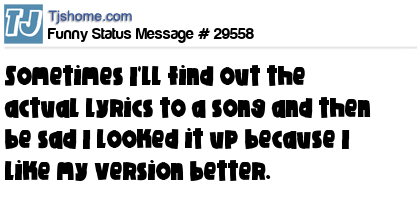 X Sometimes I'll find out the actual lyrics to a song and then be sad I looked it up because I like my version better.