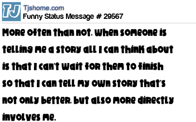 X More often than not, when someone is telling me a story all I can think about is that I can't wait for them to finish so that I can tell my own story that's not only better, but also more directly involves me.