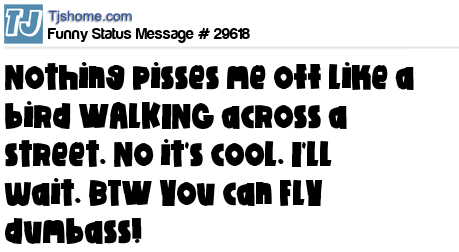- # 29172 Nothing pisses me off like a bird WALKING across a street. No it's cool. I'll wait. BTW You can FLY dumb@ss!