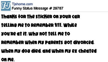 X Thanks for the sticker on your car telling me to remember 9/11. While you're at it, why not tell me to remember when my parents got divorced, when my dog died, and when my ex cheated on me.