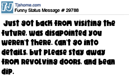 X Just got back from visiting the future, was disapointed you weren't there. Can't go into details, but please stay away from revolving doors, and bean dip.
