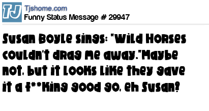X Susan Boyle sings: "Wild Horses couldn't drag me away."Maybe not, but it looks like they gave it a f**king good go, eh Susan?