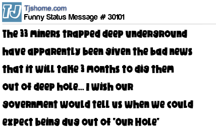 X The 33 miners trapped deep underground have apparently been given the bad news that it will take 3 months to dig them out of deep hole... I wish our government would tell us when we could expect being dug out of "Our Hole"