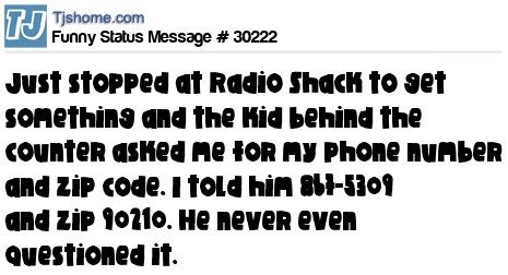 X says just stopped at Radio Shack to get something and the kid behind the counter asked me for my phone number and zip code. I told him 867-5309 and zip 90210. He never even questioned it.